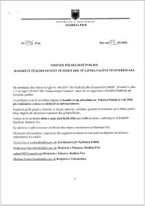 Takimi do të zhvillohet ditën e enjte datë 02.04.2026 ora 11.00 në sallën e mbledhjeve të Keshillit Bashkiak. Bashkia Fier..